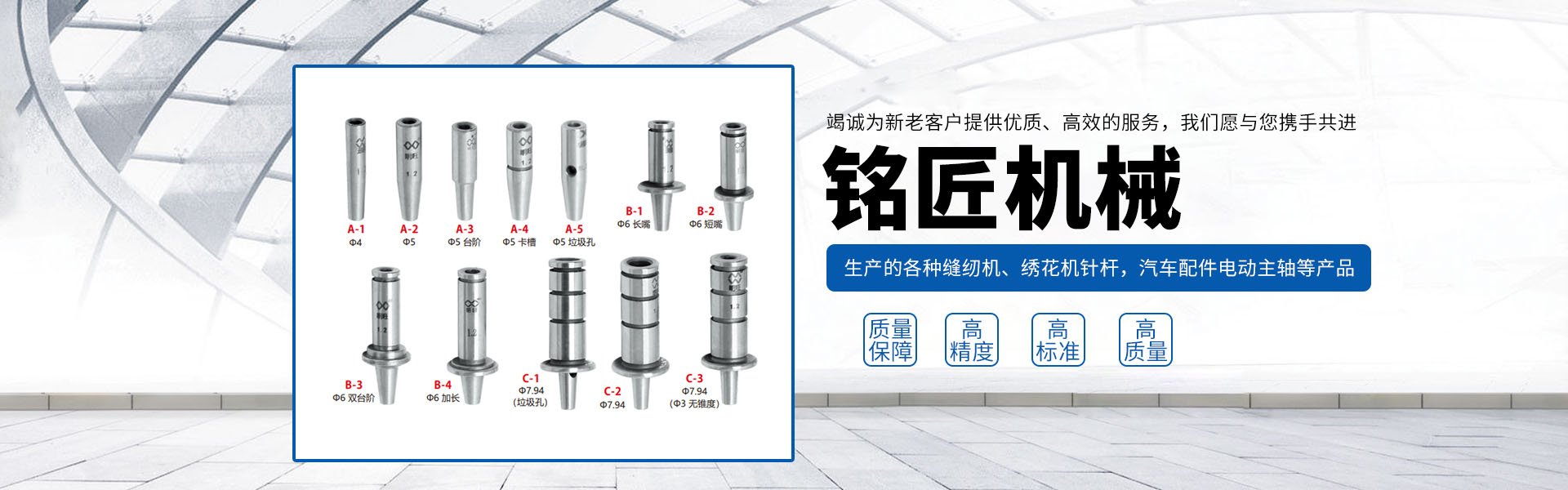 由本廠生產的各種縫紉機、繡花機針桿,汽車配件電動主軸,以及使用于紡織機、皮革機、傳真機、印刷機、鞋機、眼鏡片磨機等各種機床上的軸套類配件產品,以其高標準、高精度、高質量的特點,頗受客戶信賴。